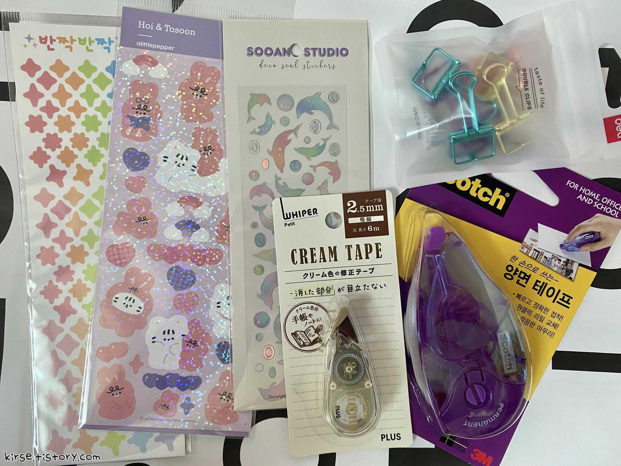 끌리는 게 없드라고... 대신 중간중간 데코 할 때 유용할만한 스티커, 그리고 누군가가^^ㅋㅋㅋㅋ 떠오르는 스티커를 샀고, 지금 유용하게 쓰고 있는 미색 종이용 수정테이프를 샀다. 원래 쓰던 게 규격 4mm인데 이건 2.5mm라 더 세밀한 부분 수정이 가능할 것 같다. 로이텀 노트에 사용 중인데 제법 유용함(품명 : whiper petit cream tape 2.5mm)