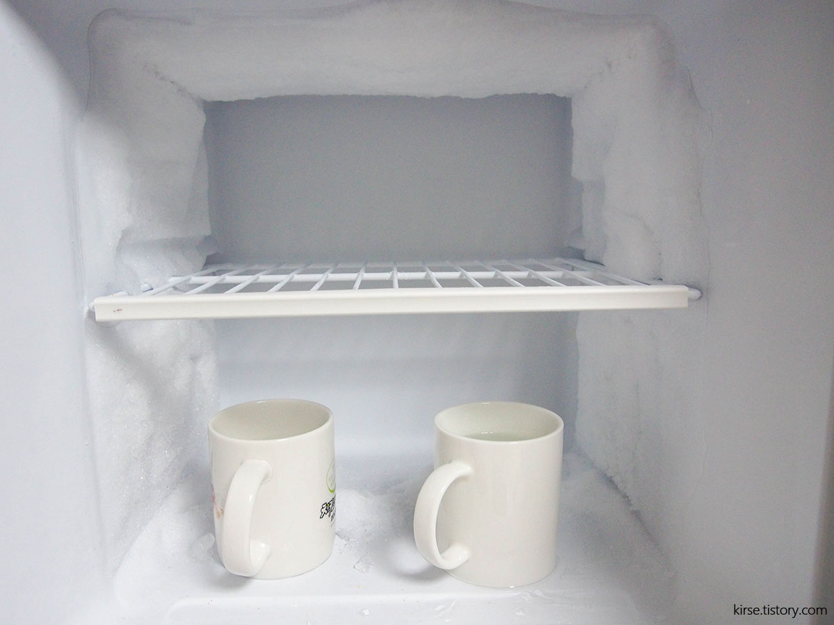 뜨거운 물을 담아둔 머그컵을 냉동칸에 넣어둔 뒤, 다른 자잘한 일들을 했다. 2~30분도 안되어 아래쪽 부분의 성에 겉면이 녹아 틈이 보이기 시작했다.
