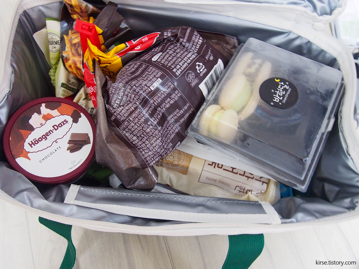 냉동실 안에 있던 아이스팩을 알비백 아래부분에 깔아둔 뒤 계속 먹을 것들만 따로 분류해서 차곡차곡 쌓았다. 남들 같으면 하루이틀만에 사라질 하겐다즈 파인트일텐데 몇달째 냉동실에서 얼어있었네...(블로그에 글을 쓰는 오늘도 여전히 자리를 지키는 중)